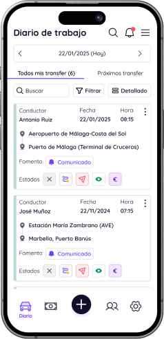 Gestiona tus transfers de manera integral con MyTransfer: organiza trayectos, controla tu flota y comunica servicios al Ministerio de Fomento con facilidad. Pruébalo gratis durante 7 días o solicita una demo personalizada para descubrir cómo optimizar tu negocio.