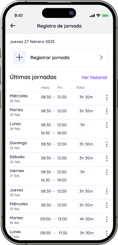 Registra y consulta jornadas laborales con varios tramos diarios. Visualiza todos los horarios desde tu panel y exporta los datos cuando lo necesites.