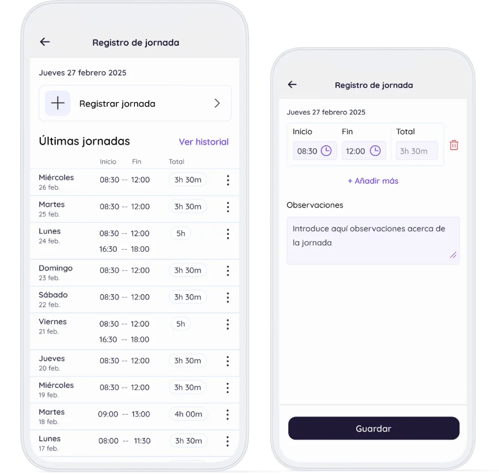 Registra y consulta jornadas laborales con varios tramos diarios. Visualiza todos los horarios desde tu panel y exporta los datos cuando lo necesites.